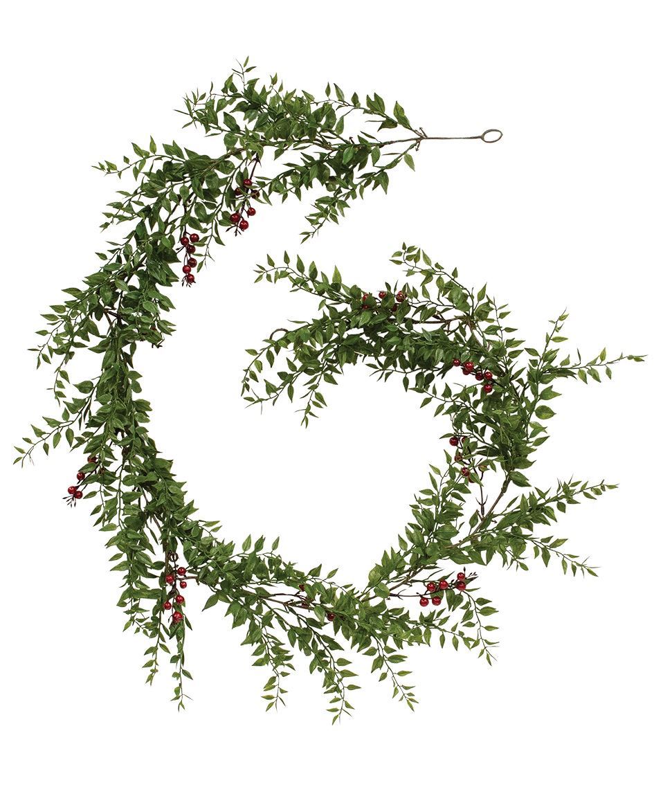 This lovely green and red garland is made of many sprigs of plastic greenery mixed with twigs of red berries. The garland is 6 ft long with a loop at one end.