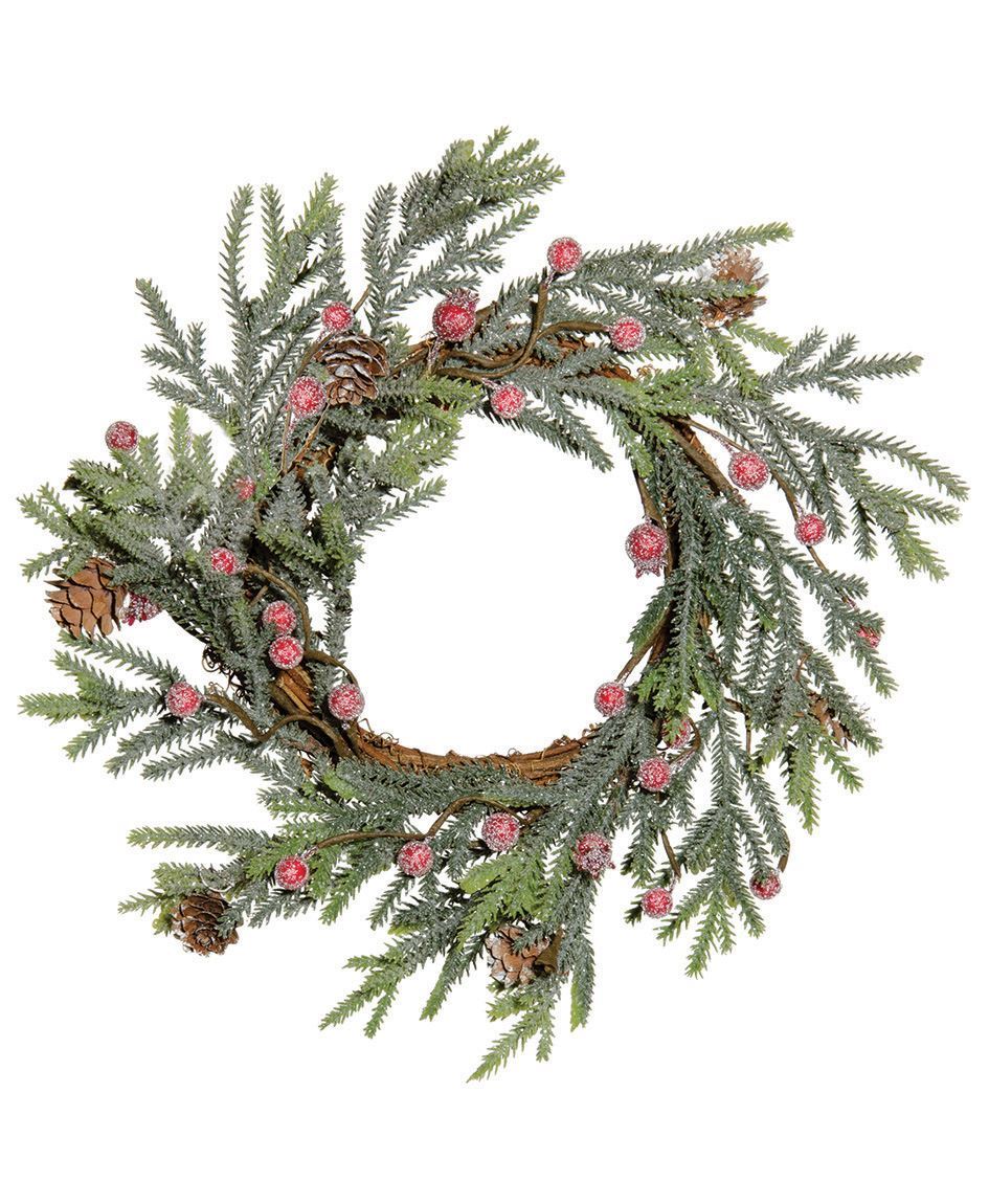 A festive winter greenery that features a mix of icy, red foam berries, frosted mini pine cones, and glittered, green plastic branches on a twig wreath base. Wreath has an inside diameter of 6" inside, and approximately 12" outside.