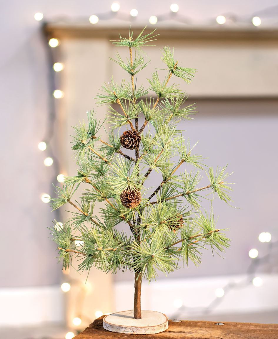 The Icy Tahoe Tree is a great way to incorporate greenery and nature into your winter decor. With frosted leaves and pinecones throughout the branches of the small artificial tree, it looks as if you’ve just brought it in from the cold. It stands at 15” high on a wood slice base.