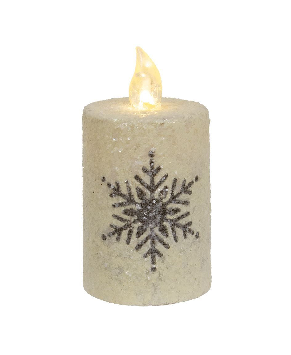 Rustic plastic candle with a distressed white glittery paint finish and gray snowflake. Candle is topped with a silicon flame. It measures 2.5" in diameter and 3" in height. The candle requires 2 AA batteries (not included) and has a timer function that lights for 6 hours and turns off for 18 hours