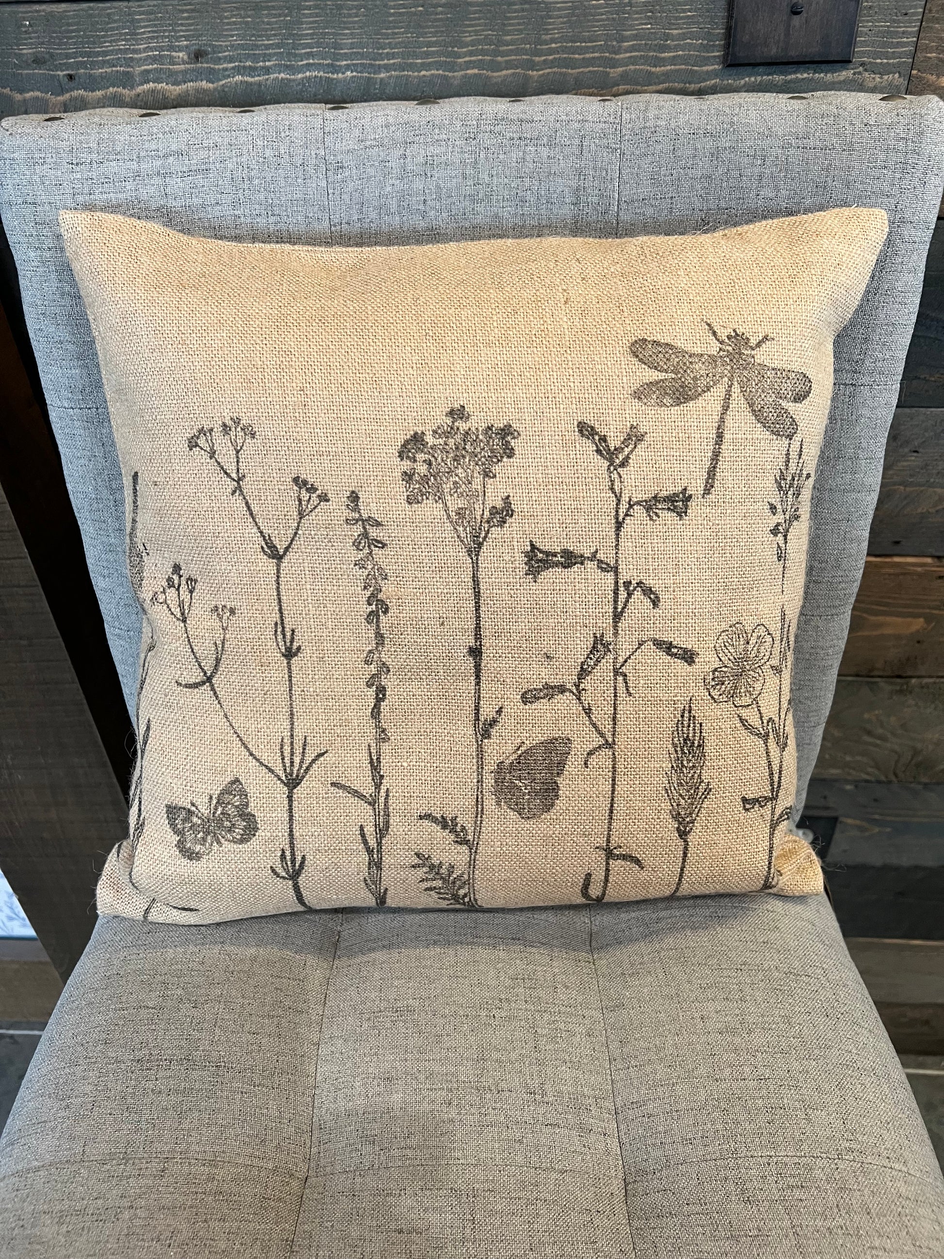 Simple yet beautiful. Wildflowers on a natural burlap pillow. Measures 16”x16”