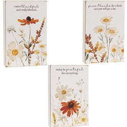 Grateful for Everything Fall Floral Box Signs each depicts fall florals and “grateful” script text. Each sign features a flat base for stable display and measures 9" high by 6" wide by 1.5" deep.