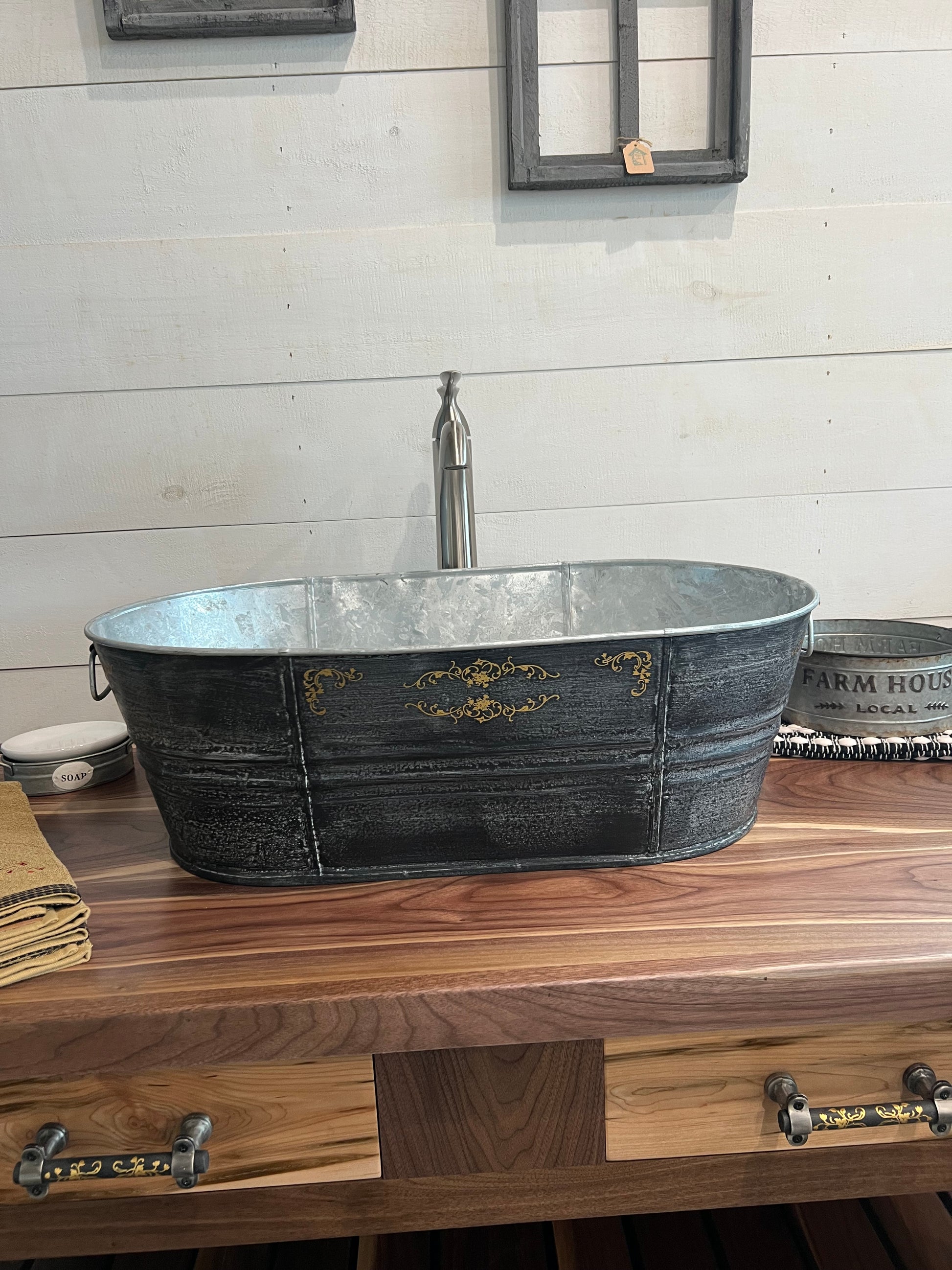Vanity is handcrafted by NabZ Woodworks. Made of character walnut and spalted maple with painted and embellished galvanized tub sink and matching drawer pulls. Features a lower slatted shelf. Includes faucet and drain.