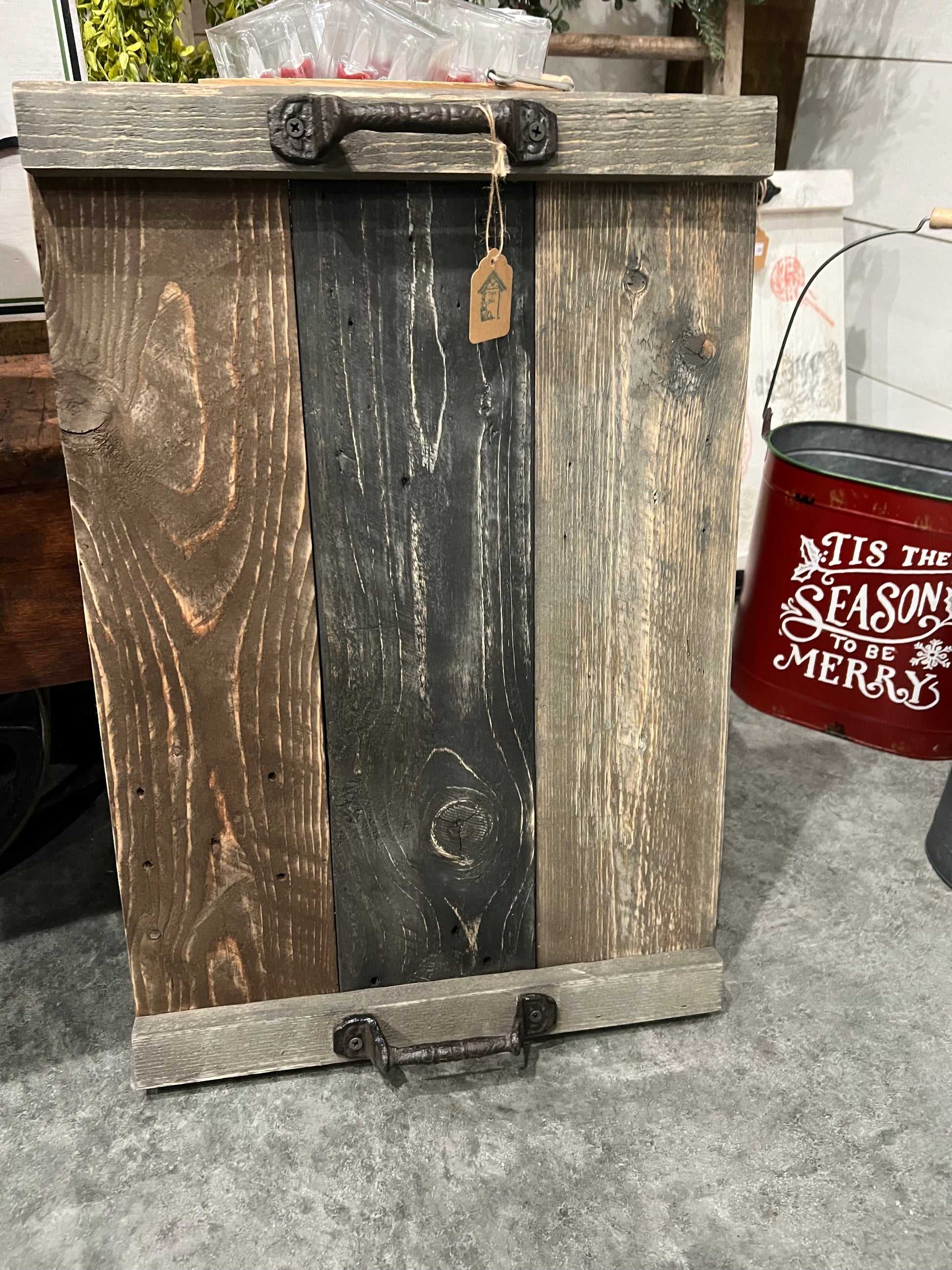 Custom wood tray by Timber & Grace. Multi-colored rustic wood tray with decorative handles.