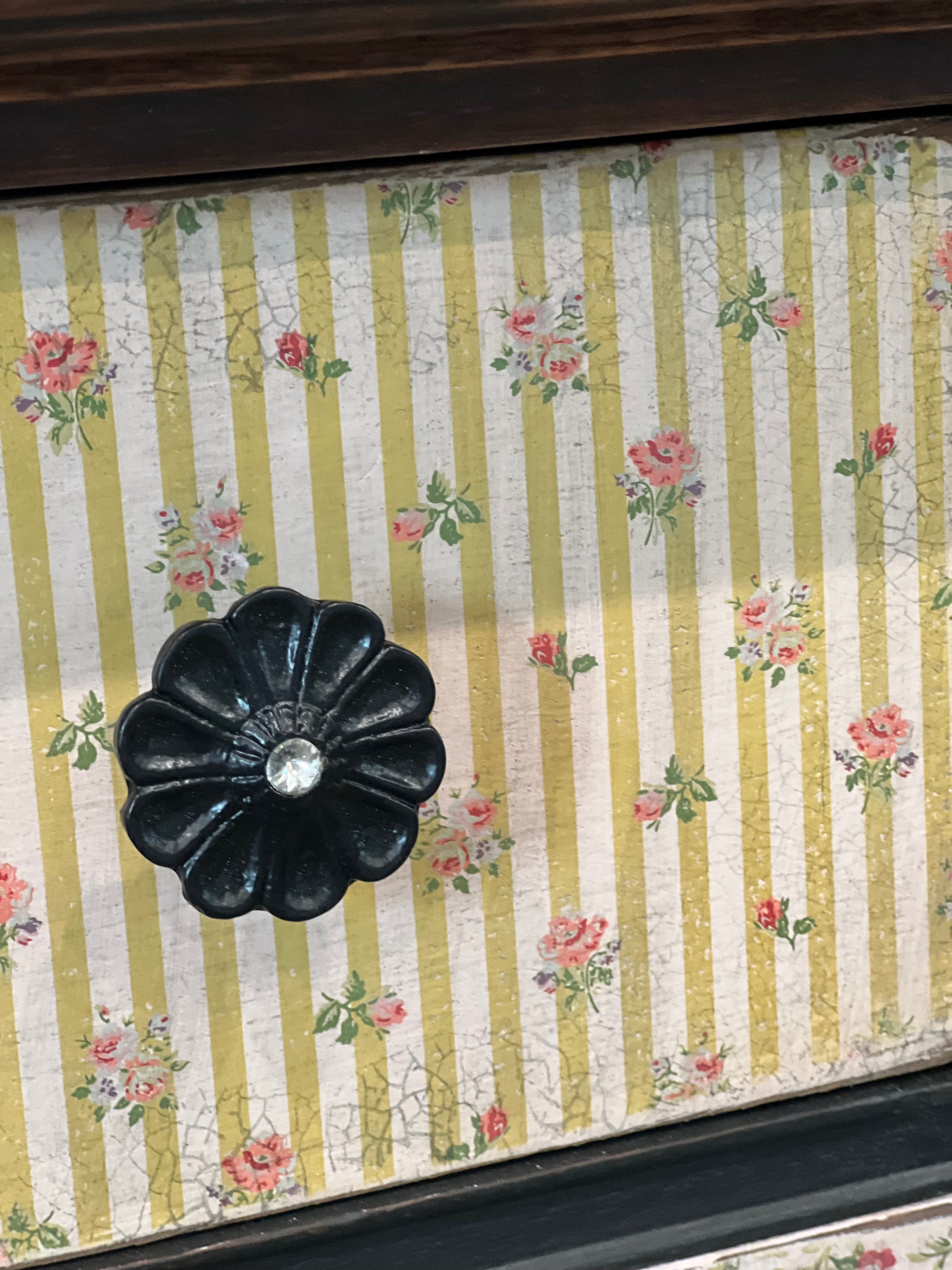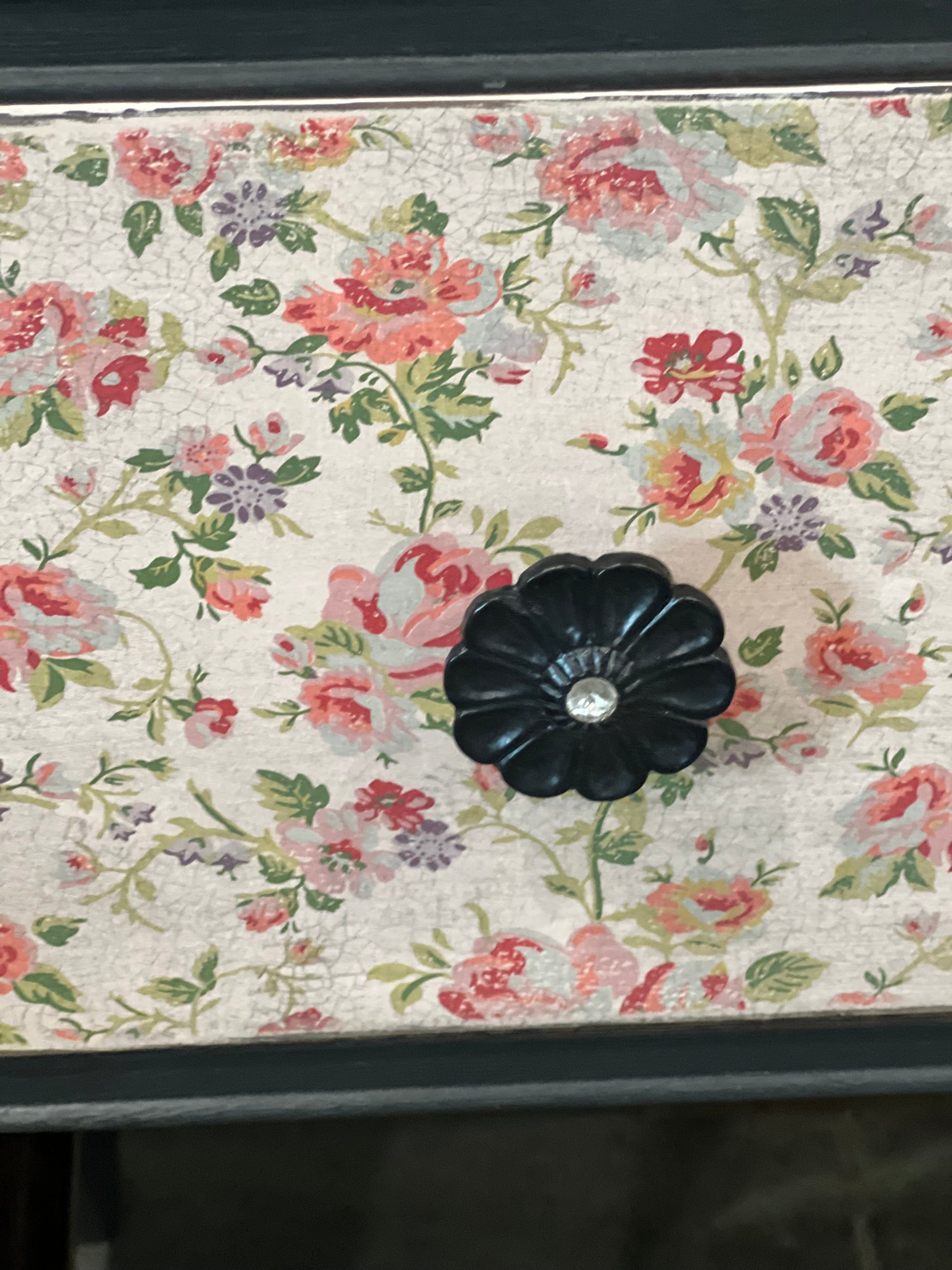 By Timber & Grace. This cute antique dresser has been given a fresh look with cute vintage floral drawers and black base. The top has been left original to reflect its aged beauty.