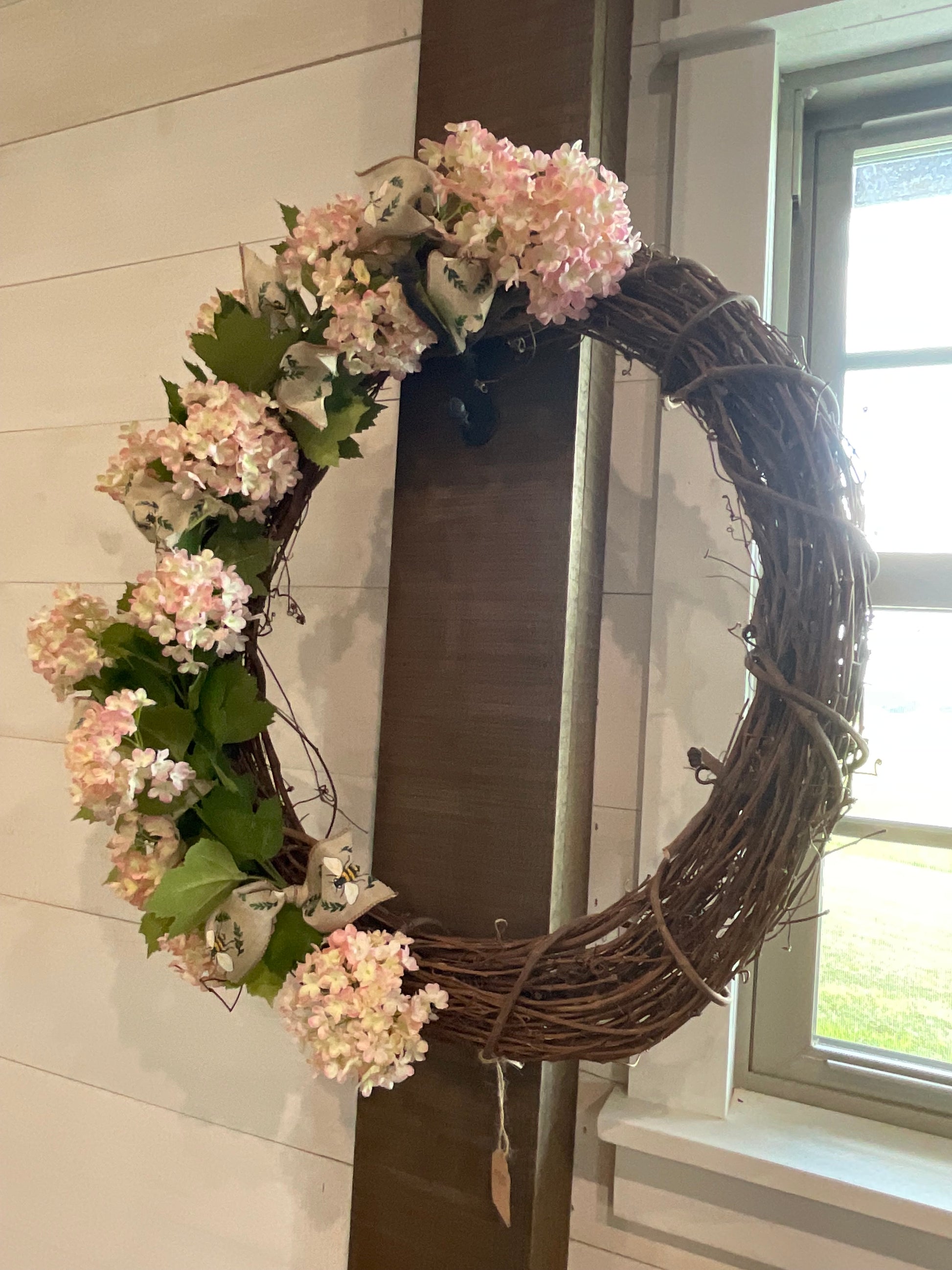 Simple yet elegant, this grapevine wreath features pink hydrangeas and honeybee ribbon accents. Wreath is approximately 22”