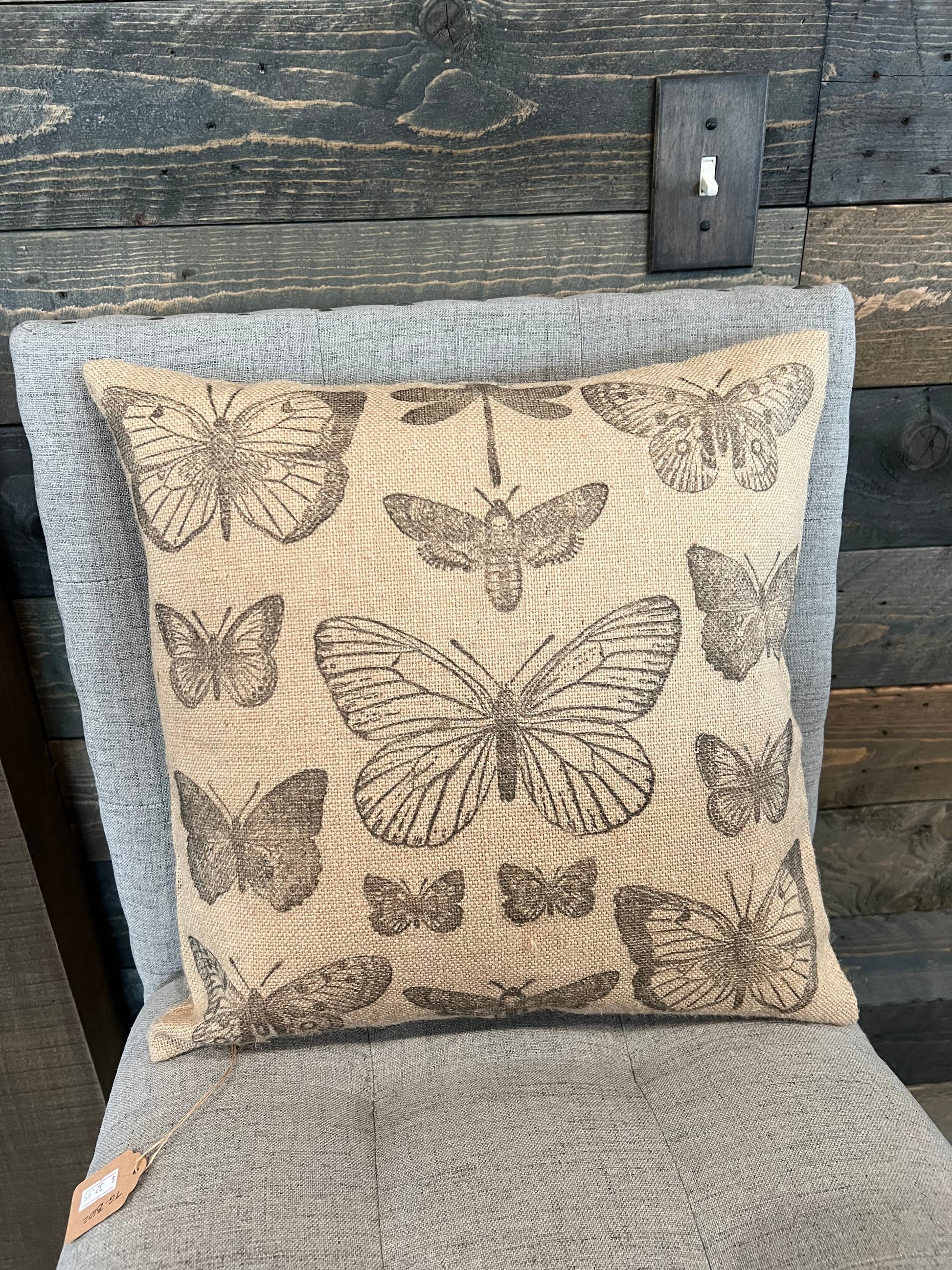 Simple yet beautiful. Butterflies on a natural burlap pillow. Measures 16”x16”