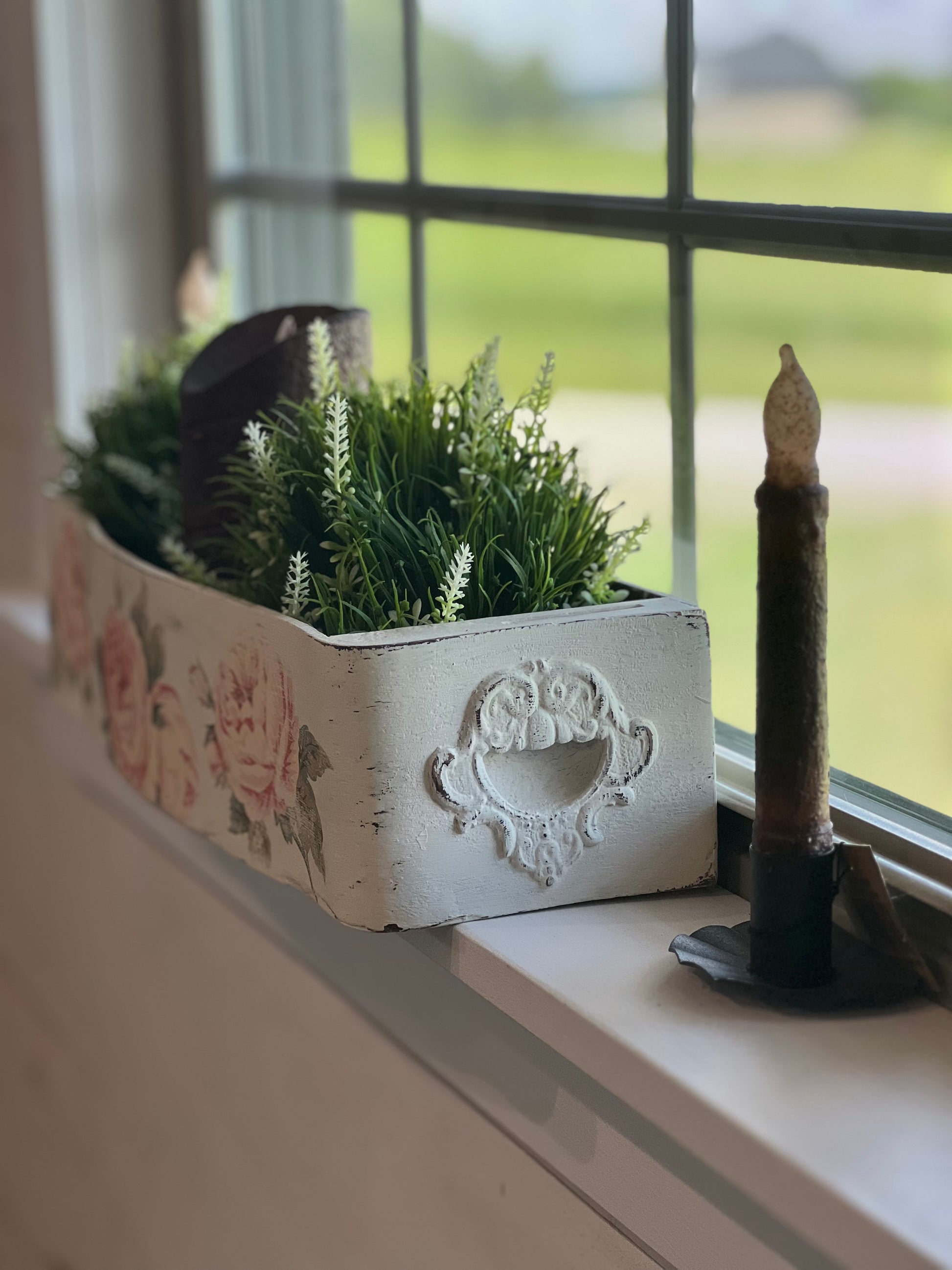 Antique sewing drawer repurposed into a beautiful vintage style box. Interior is kept natural to reflect its natural aged beauty while the exterior is finished in an antique white with pink roses.