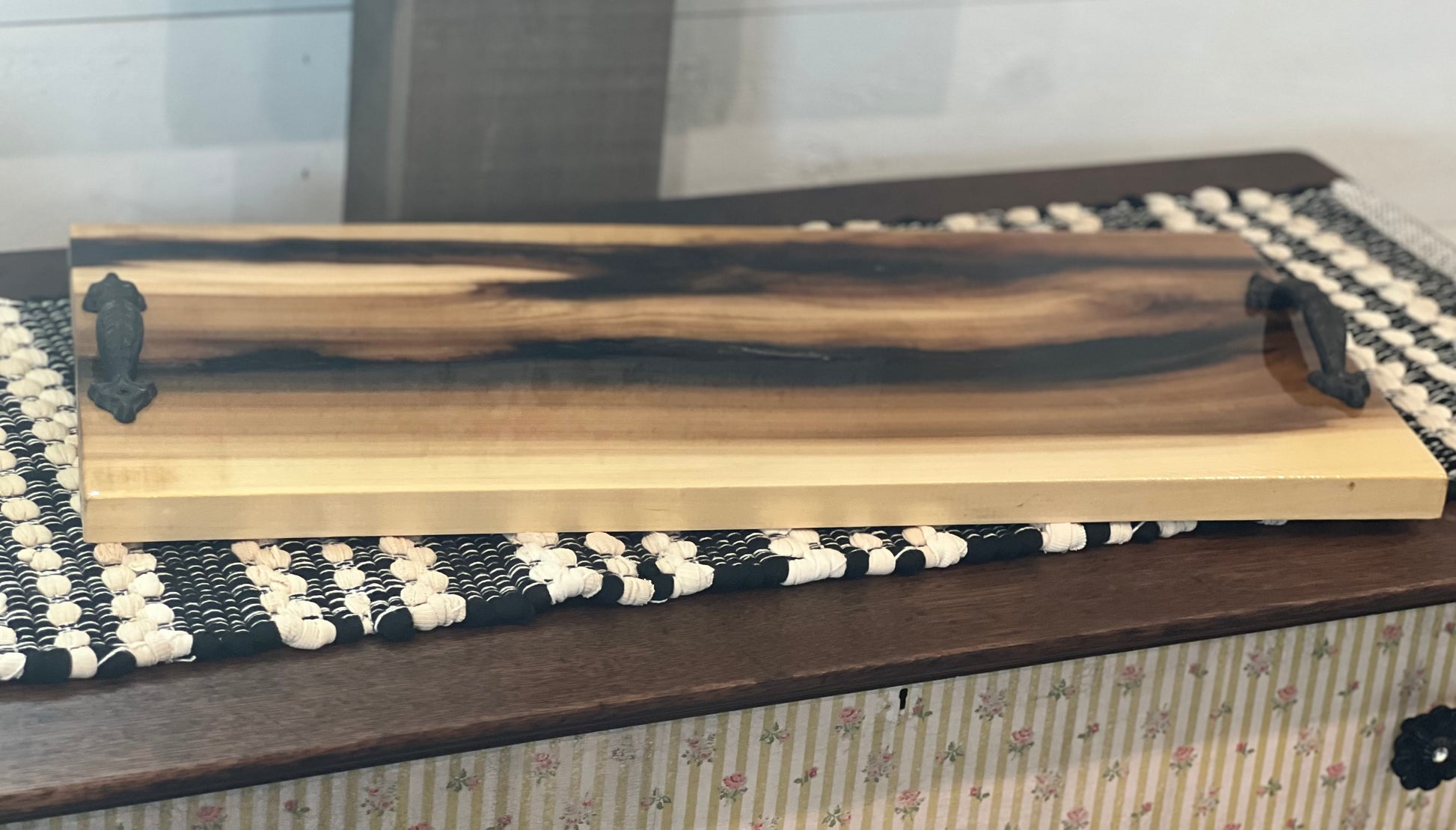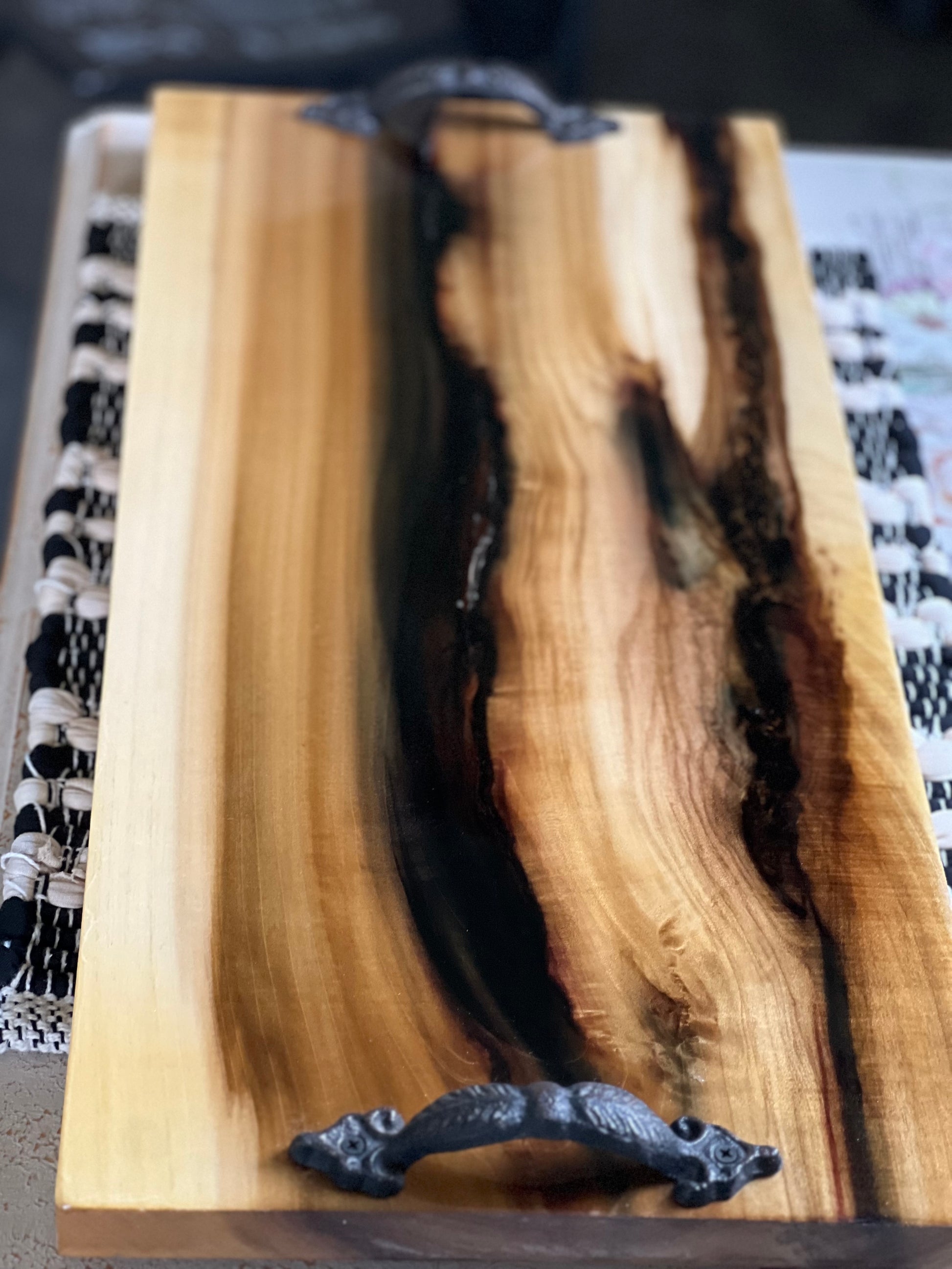 Character poplar wood tray with an epoxy coat and rustic handles.