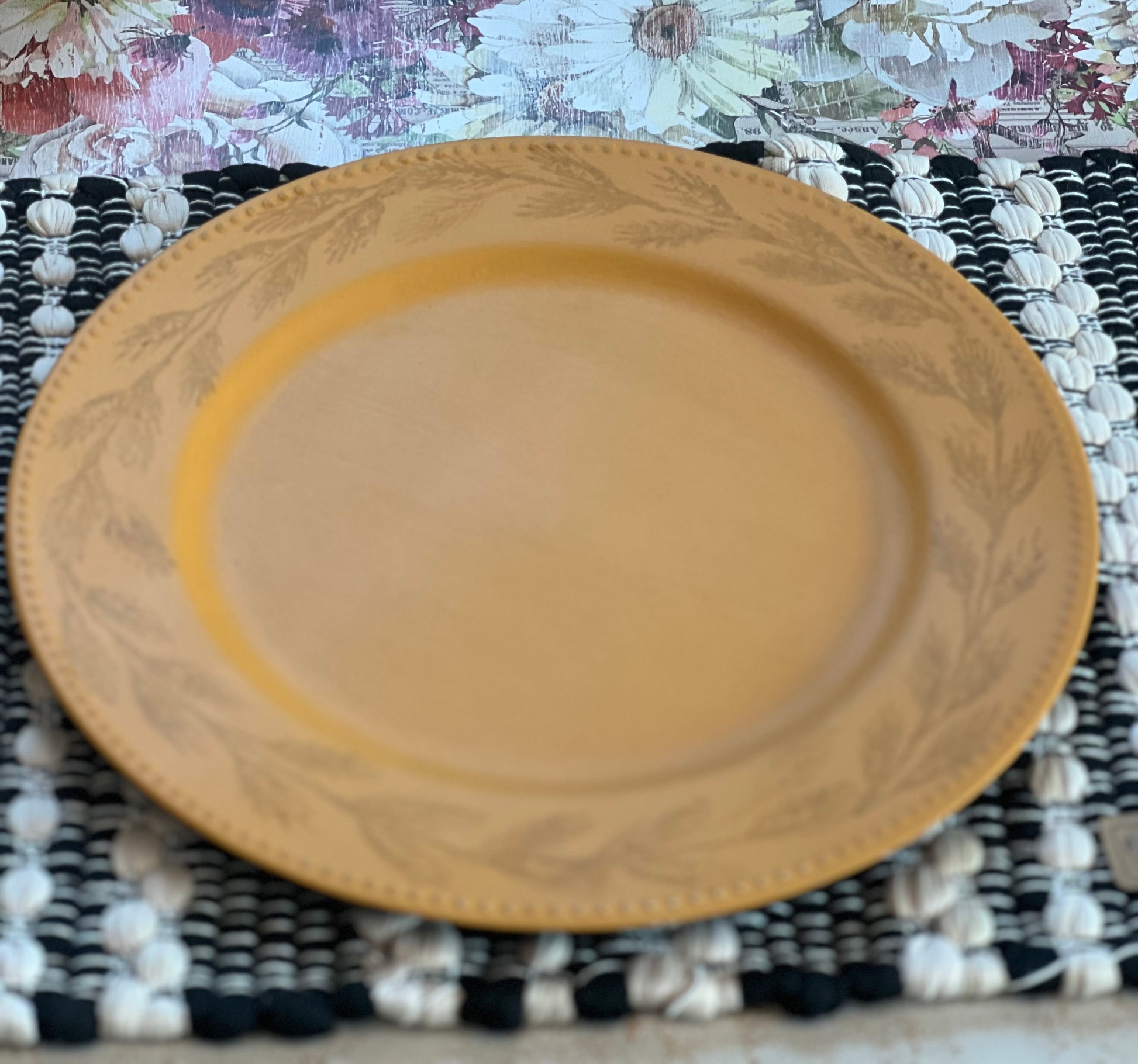 By Timber & Grace. Beautiful golden fall yellow with stamped wheat boarder. The perfect addition to your fall table.